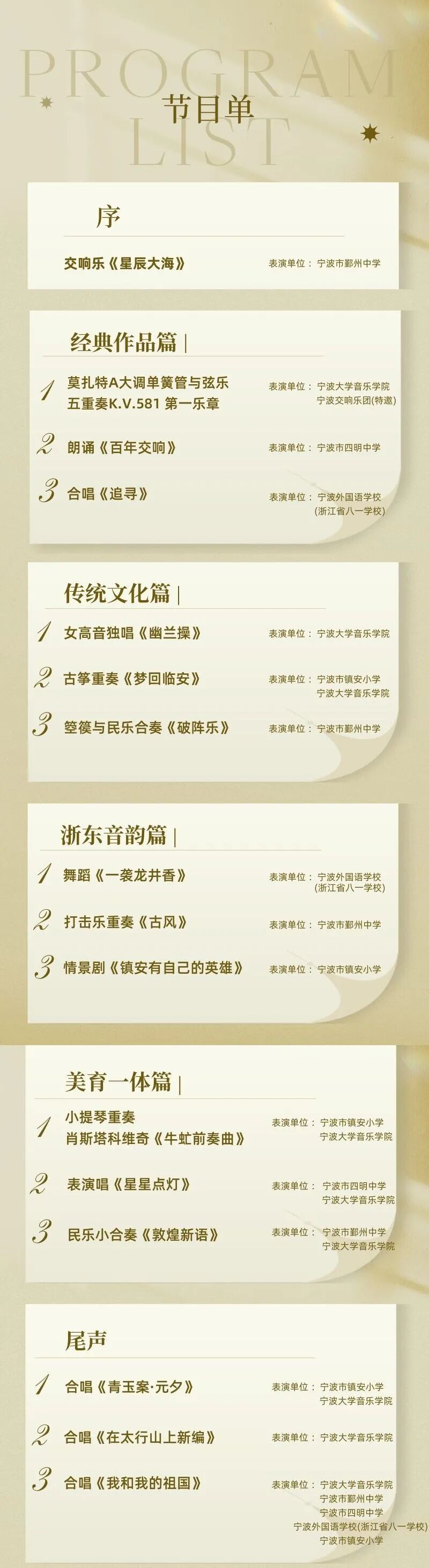 当童真与专业共鸣,当传承与创新碰撞,一场跨越学段的美育盛宴即将点燃艺术与教育的火花!2025年9月17日19:00,“成长的旋律”宁波大学大中小美育一体化教学成果展演将在宁波文化广场大剧院拉开帷幕。im电竞-电竞博彩 携手宁波市鄞州中学、宁波市四明中学、宁波外国语学校(浙江省八一学校)和宁波市镇安小学,通过音乐、舞蹈、戏剧等多元化的形式,全面呈现大中小美育一体化建设的创新实践与丰硕成果!